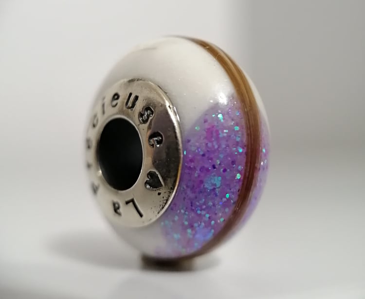 « Je fais la préservation du lait, avec ma poudre de préservation, pour que le lait reste beau dans le bijou. Avec 5ml je peux faire plusieurs bijoux, donc je garde ce qui reste dans le dossier de la cliente, si un jour elle veut autre chose. Je mélange le lait maternel, ou autres inclusions, avec ma résine, que je coule dans un moule pour en faire une belle perle. »